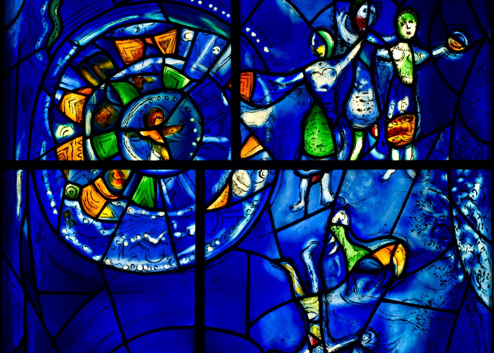 Chagall’s floating people appear many times in his works. His art is replete with both personal and universal myths, symbols and mysticism. In his wonderful stained glass windows, like the one above, we can see people floating through the air, defying gravity, dream-like.